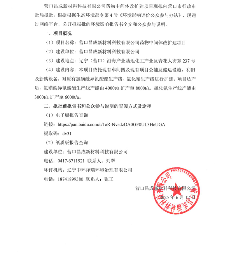 營口昌成新材料科技有限公司藥物中間體改擴(kuò)建項(xiàng)目環(huán)境影響評價(jià)公示(報(bào)批前公示)